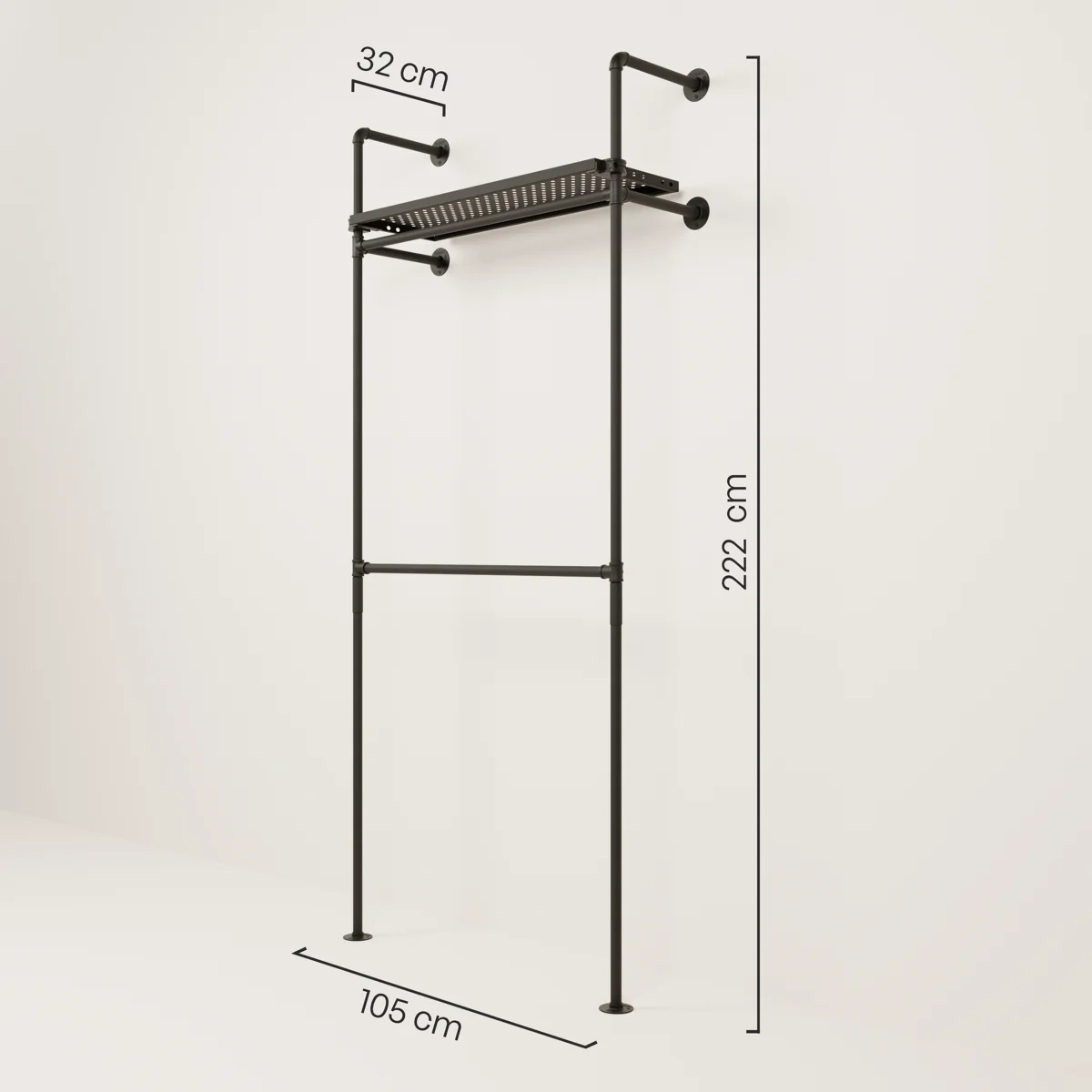 Finde das passende Regalsystem Kleiderschrank bei pamo. Wir entwickeln Rohrmöbel im Industrial Style und verbinden Design mit Funktionalität. Unser Kleiderschrank Regalsystem KIM DOUBLE 1 METAL 1 kommt mit einer praktischen Metallablage für Kisten, Hüte oder Schäle und verbindet Hängeplatz mit einer nützlichen Ablagefläche. Mach mehr aus deinem Platz mit unserem Regalsystem Kleiderschrank.